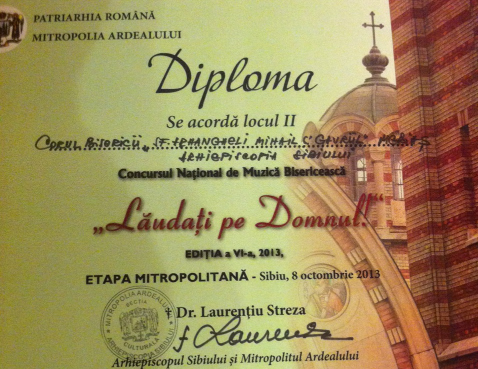 În cursul zilei de ieri avut loc etapa mitropolitana a concursului national ,,Laudati pe Domnul”, editia a VI-a, organizat de Patriarhia Romana. Au participat 5 coruri apartinand celor 5 episcopii ale mitropoliei Ardealului, toate castigand in etapa eparhiala locul 1. Corala ,,Sfintii Arhangheli” a Catedralei Ortodoxe Medias a obtinut locul 2, dupa Corul ” Bisericii cu luna”. De precizat ca fiecare cor a reprezentat o episcopie astfel, Corala catedralei Medias-Arhiepiscopia Sibiului, Corul ” Bisericii cu luna”-Episcopia Oradiei, Corul din Brad-Episcopia Devei si Hunedoarei, Corul din Campeni- Episcopia Albei, iar Corul din Miercurea-Ciuc- Episcopia Covasnei si Harghitei.