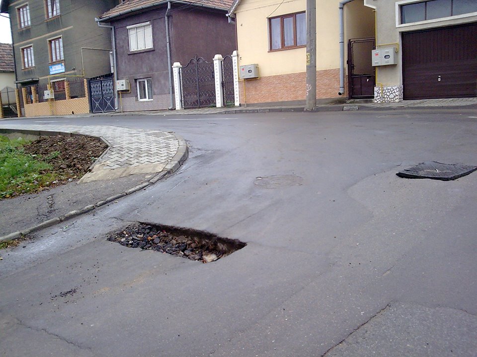 Străzile municipiului Mediaş ascund veritabile capcane pentru şoferi. Una dintre acestea este la intersecţia străzilor Iacob Pissso cu Iuliu Maniu, unde o gaură cu adâncime de peste 25 centimetri se întinde pe o bandă de circulaţie. Imaginile au fost trimise pe adresa Nova TV de Andrei Zilahi.