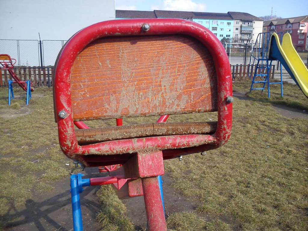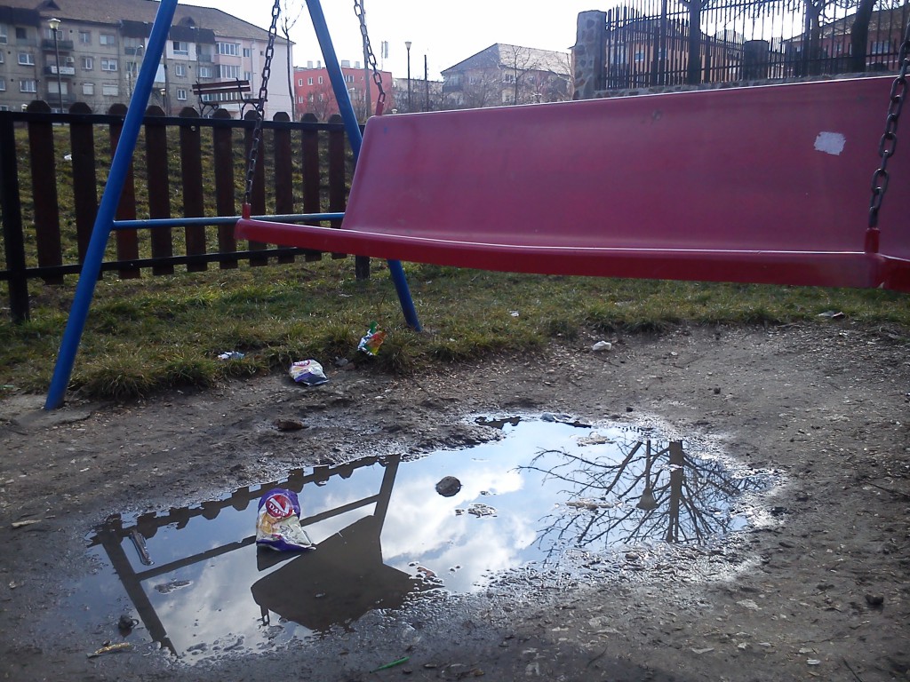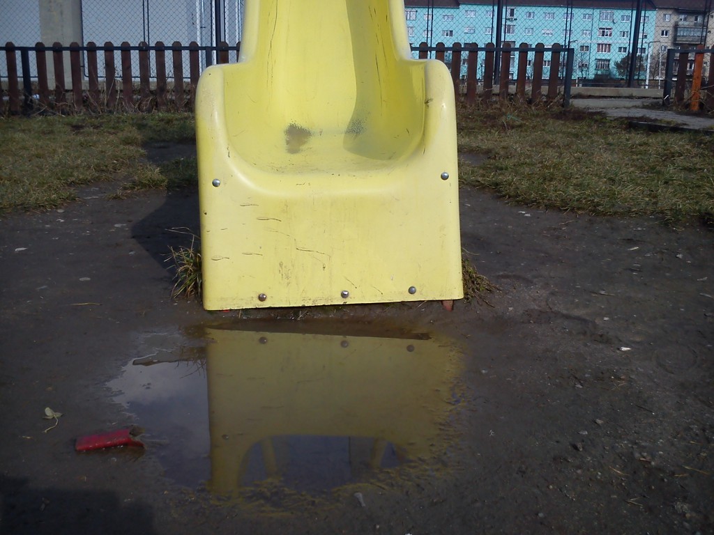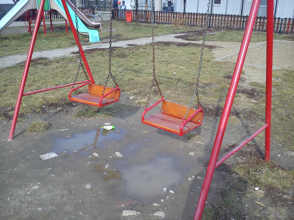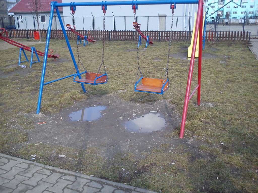 Subiectul nu este nou. A fost tratat de Ştirile Nova TV anul trecut, am organizat chiar şi o campanie intitulată generic ,,Copiii Mediaşului merită locuri de joacă civilizate”. Rezultatul a existat, în toate parcurile de joacă pentru copii din oraş, aparatele rupte au fost înlocuite cu unele noi. Din păcate cam asta a fost tot. În momentul de faţă în municipiul Mediaş nu există nici măcar un singur loc de joacă care să poate fi numit civilizat şi care să ofere siguranţă celor care îl folosesc. Dintr-un motiv care mie personal îmi scapă, la Mediaş nu s-a auzit de dalele de cauciuc care trebuie să ofere un anumit grad de siguranţă copiilor. Avem în schimb peste tot noroi şi apă, de pe hintă ajungi direct în baltă, de pe tobogan la fel. Imaginile de mai jos au fost realizate astăzi în cele mai mare loc de joacă pentru copii din cartierul Vitrometan. Din păcate aparatele de joacă sunt greu de folosit pentru copii, în condiţiile în carea arată aşa. Situaţia este aceeaşi în toate locurile de joacă din oraş, iar întrebarea firească este nu merită oare copiii ceva mai mult? Chiar este nevoie ca noi părinţii (aşa cum citeam zilele trecute în grupul Iniţiativă pentru Mediaş) să rezolvăm cumva această problemă? În rândul autorităţilor locale, chiar nimeni nu are ochi de văzut şi urechi de auzit?