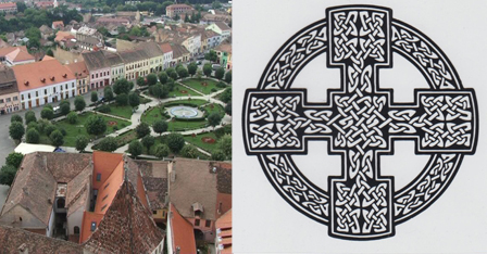 În diferite articole şi cărţi publicate, gen „În căutarea egregorei. O scurtă istorie ilustrată a francmasoneriei transilvane ” (Editura Muşatinii, Suceava 2011, p. 95 – 96) sau în volumul pe care îl pregătesc pentru lansare, „Egregora din Mediaş”, am arătat că parcul central din Piaţa Regele Ferdinand I din municipiul Mediaş este un monument esoteric de sine stătător, dar şi o continuitate a esoterismului oraşului nostru. Vă amintesc că vorbim de un monument istoric, chiar dacă nu e clasificat oficial în această categorie. Logica existenţei unui singur brad argintiu în parc, pe lângă copacii şi arbuştii existenţi după cum ne arată istoricul mason Jean Ferré, printr-o trimitere la manuscrisul „Trinity College” unde apare explicaţia că „pentru a verifica dacă cineva este frate sau nu, semnele sunt (L □ ^ )” anume acela de a întruni cele trei semne de recunoaştere Echer, Dreptunghi, Compas. Faptul a fost înţeles, bradul n-a fost mişcat de când e el acolo, ba mai mult edilii ulteriori au dovedit că înţeleg mesajul, pentru că l-au continuat, formând în mijlocul parcului Crucea Celtică ce, aşa cum se ştie, se reduce la un triunghi. Iată cele trei semne, cât şi Crucea cu trei cercuri, în desenele parcului din Piaţa Regele Ferdinand I.