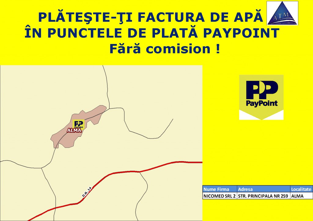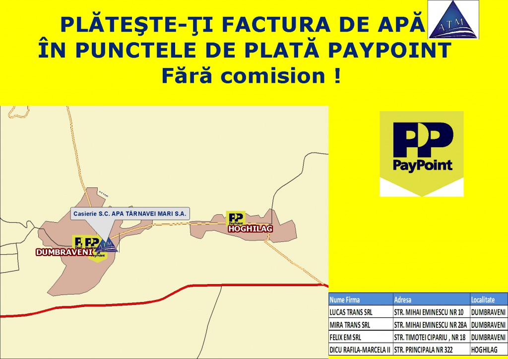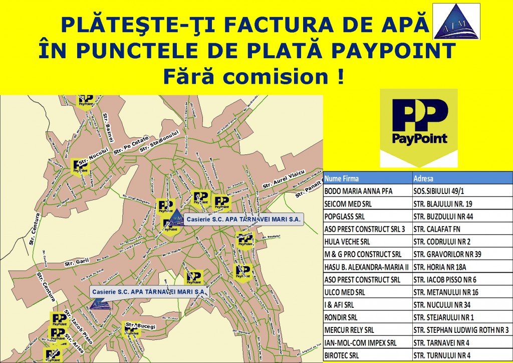 Serviciul se adresează clienţilor din zona de nord-est a judeţului Sibiu (municipiul Mediaş, aglomerările Agnita şi Dumbrăveni, comunele Arpaşu de Jos, Cârțișoara și Alma) deserviţi de S.C. „Apa Târnavei Mari” S.A.. În vederea efectuării unei plăţi, clientul trebuie doar să se prezinte cu factura în cel mai apropiat magazin în care se găseşte un terminal PayPoint, vânzătorul scanează codul de bare de pe factură, clientul plăteşte suma în numerar şi primeşte un exemplar al chitanţei cu detaliile tranzacţiei (data plăţii, suma, locaţia, furnizorul etc). Întreaga operaţiune este foarte rapidă şi reduce considerabil timpul alocat plăţii facturilor. În plus, comisionul la plata facturii este zero.