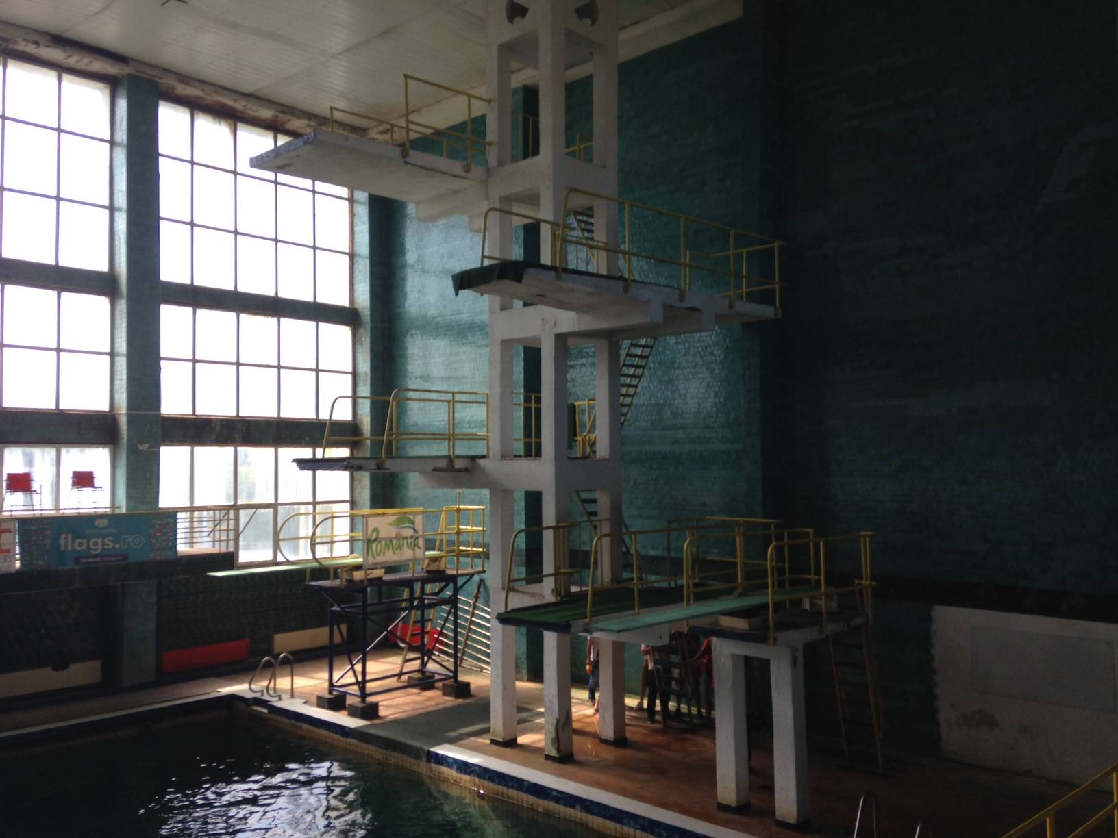 La mai bine de o lună de la accidentul suferit de fetiţa de zece ani care a căzut de pe o trambulină de la o înălţime de opt metri, bazinul are în continuare pereţii mucegăiţi, mizeria domneşte peste tot, iar singurele reparaţii s-au făcut la scările de acces la trambuline.