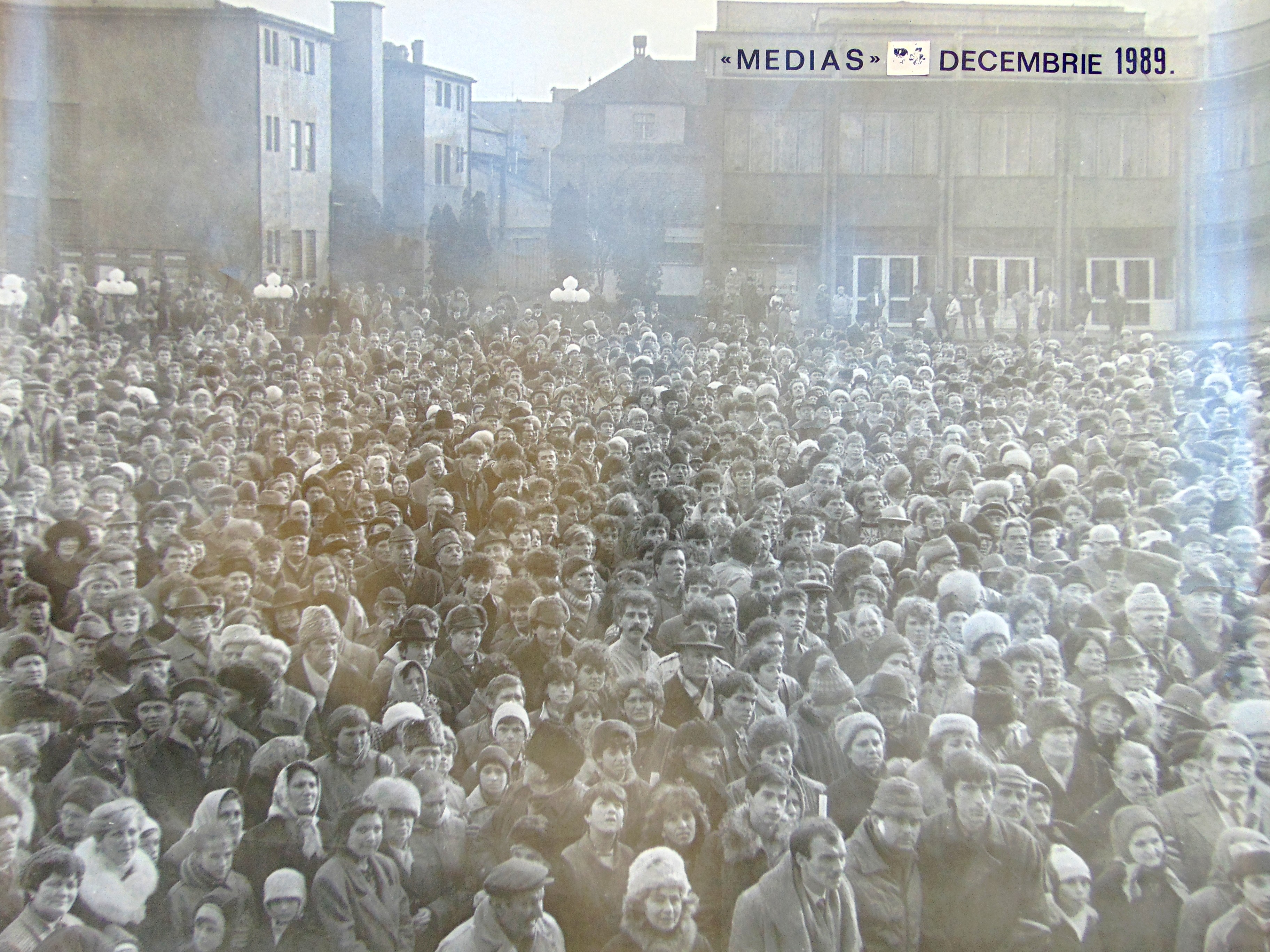 Foarte mulţi medieşeni s-au strâns în Piaţa Corneliu Coposu la o adunare publică. Imaginea de mari dimensiuni este păstrată în arhiva foto a Muzeului Municipal Mediaş.