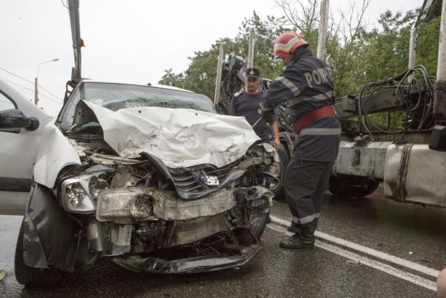 Conform poliţiei rutiere, accidentul s-a produs din cauza unei maşini care, în curbă, a intrat cu viteză pe contrasens, în condiţii de ploaie.