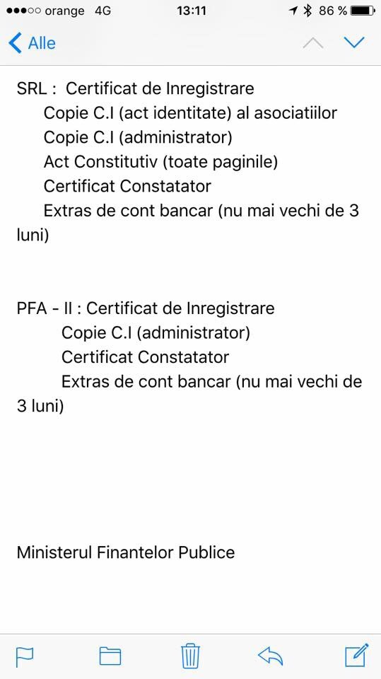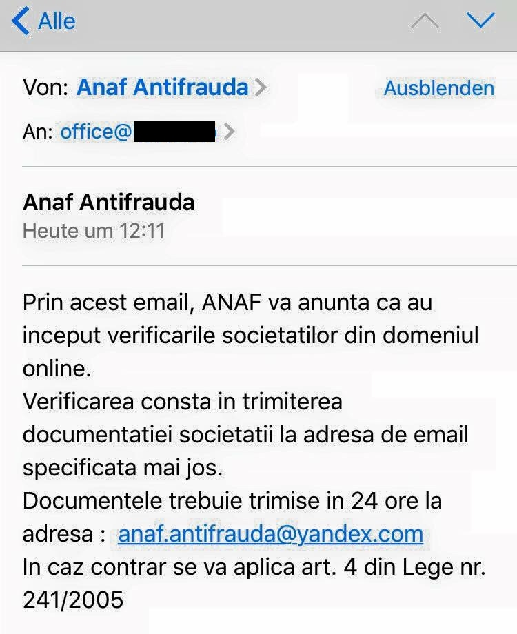 ,,Directia Generala Antifrauda Fiscala avertizeaza asupra unei tentative frauduloase de colectare a unor date confidențiale (phishing) si recomanda tuturor reprezentanților operatorilor economici sa ignore orice solicitare de date confidentiale primita de la adrese de email cu origine indoielnica, precum cele anexate. Precizam ca inspectorii antifrauda pot accesa aceste informatii din bazele de date ale ANAF, iar orice alte date suplimentare sunt solicitate oficial in cadrul controalelor antifrauda inopinate” se arată într-un comunicat de presă remis de către Directia Generala Antifrauda Fiscala.