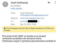 În ultimele au fost înregistrate mai multe tentative frauduloase de colectare a unor date confidenţiale prin utilizarea de adrese de e-mail care includ termenii „antifraudă” şi „ANAF”.