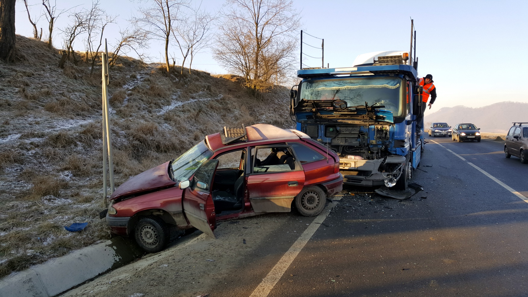 Un conducător auto nu a adaptat viteza într-o curbă, a pătruns pe contrasens şi a intrat în coliziune cu un tir. În urma impactului, acesta a fost rănit. Traficul în zonă se desfăşoară alternativ.
