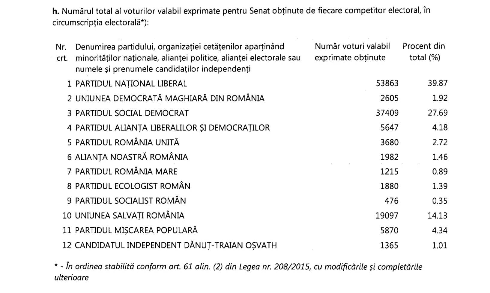 La Camera Deputaților liberalii au strâns 53.398 voturi adică 39,52%, PSD a avut 38.100 voturi, respectiv 28,2%, iar pe poziția a treia s-a clasat USR cu 19.000 voturi adică 14,06%.