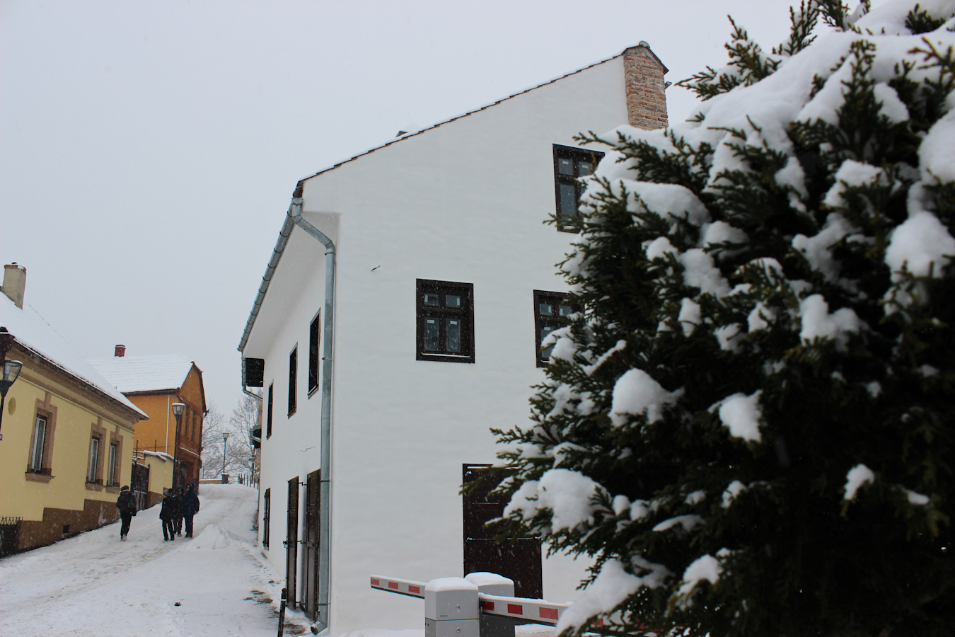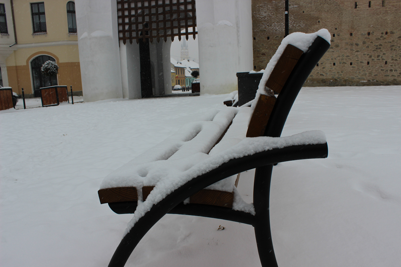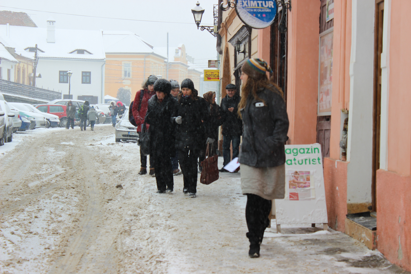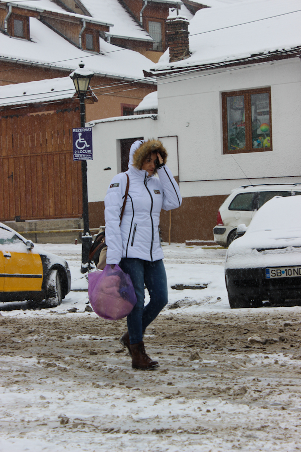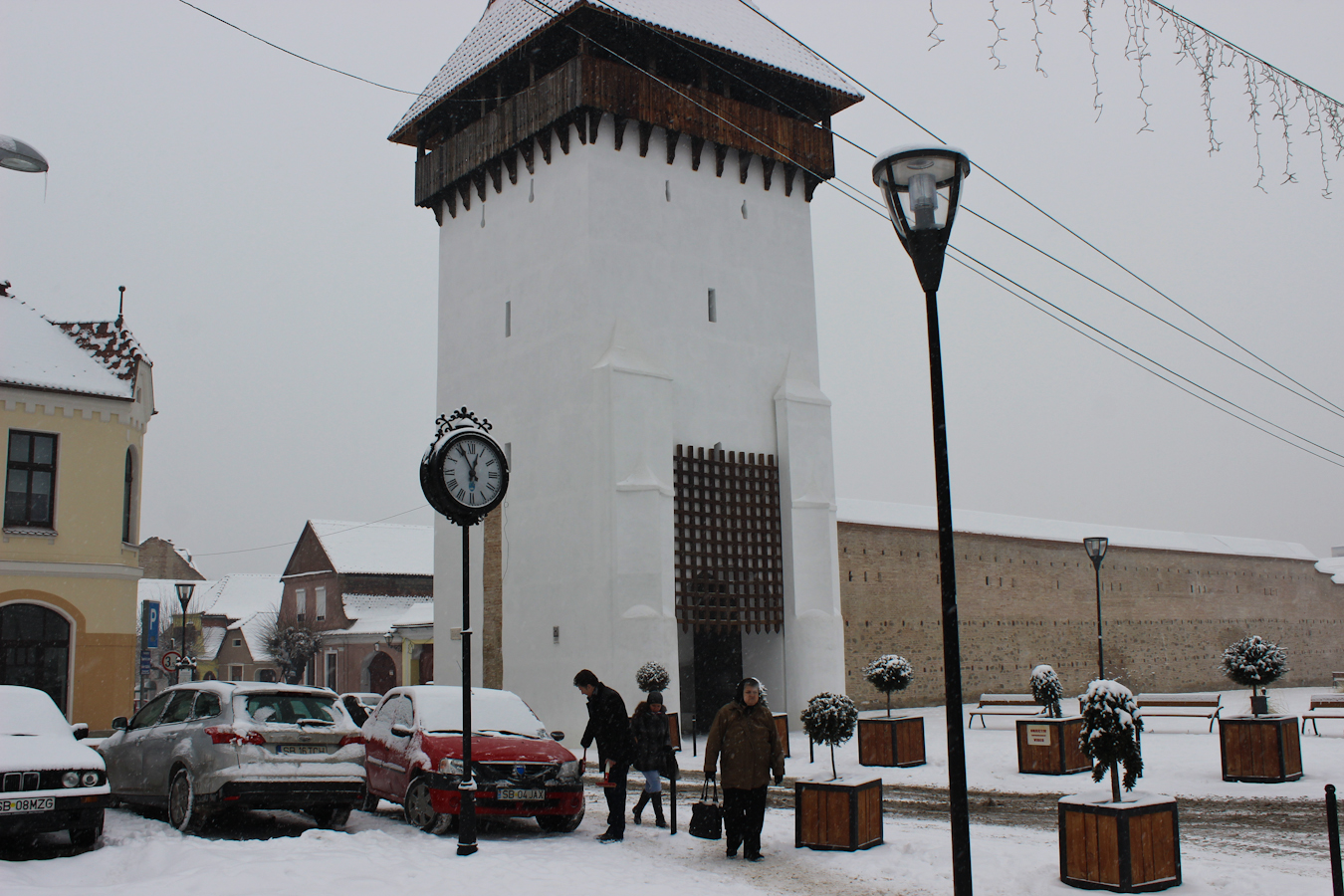 Burgul medieval a fost acoperit de zăpadă. Totul e alb oriunde întorci capul. Străzile, trotuare, casele și chiar oamenii și-au schimbat culoarea.