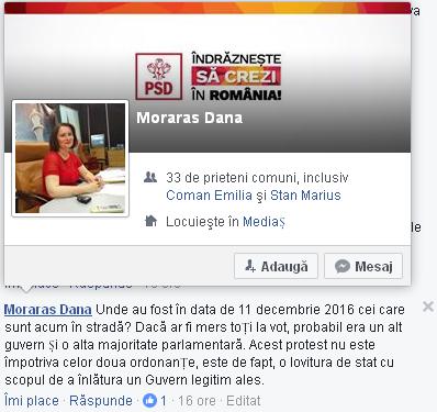 Postările consilierului local PSD, Dana Morăraş, au venit după ce unul dintre membrii grupului a postat textul Va cauta lumea din Medias dragi psd-isti! însoţit de fotografiile consilierilor PSD Mediaş, precum şi a preşedintelui filialei locale, Viorel Arcaş.