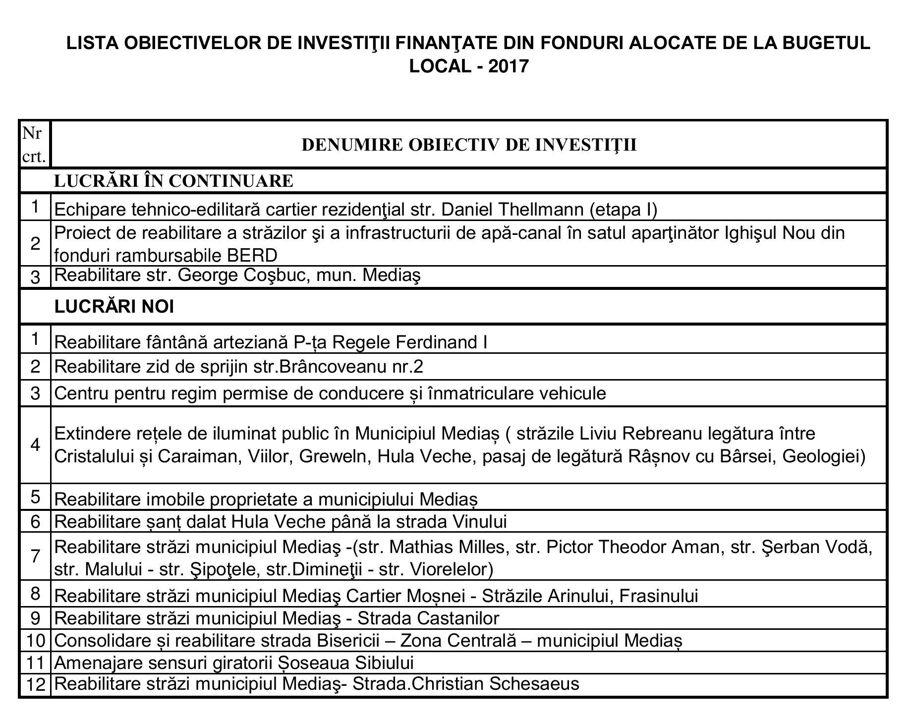 În bugetul pentru anul 2017 au fost prevăzute şi fondurile necesare pentru continuarea unor lucrări de investiţii care au demarat pe raza municipiului Mediaş în anii anteriori. Concret este vorba de echiparea tehnico-edilitară a cartierului rezidenţial strada Daniel Thellmann, etapa I, poiectul de reabilitare a străzilor şi a infrastructurii de apă-canal în satul aparţinător Ighişul Nou din fonduri rambursabile BERD, dar şi proiectul de reabilitare al străzii George Coşbuc.