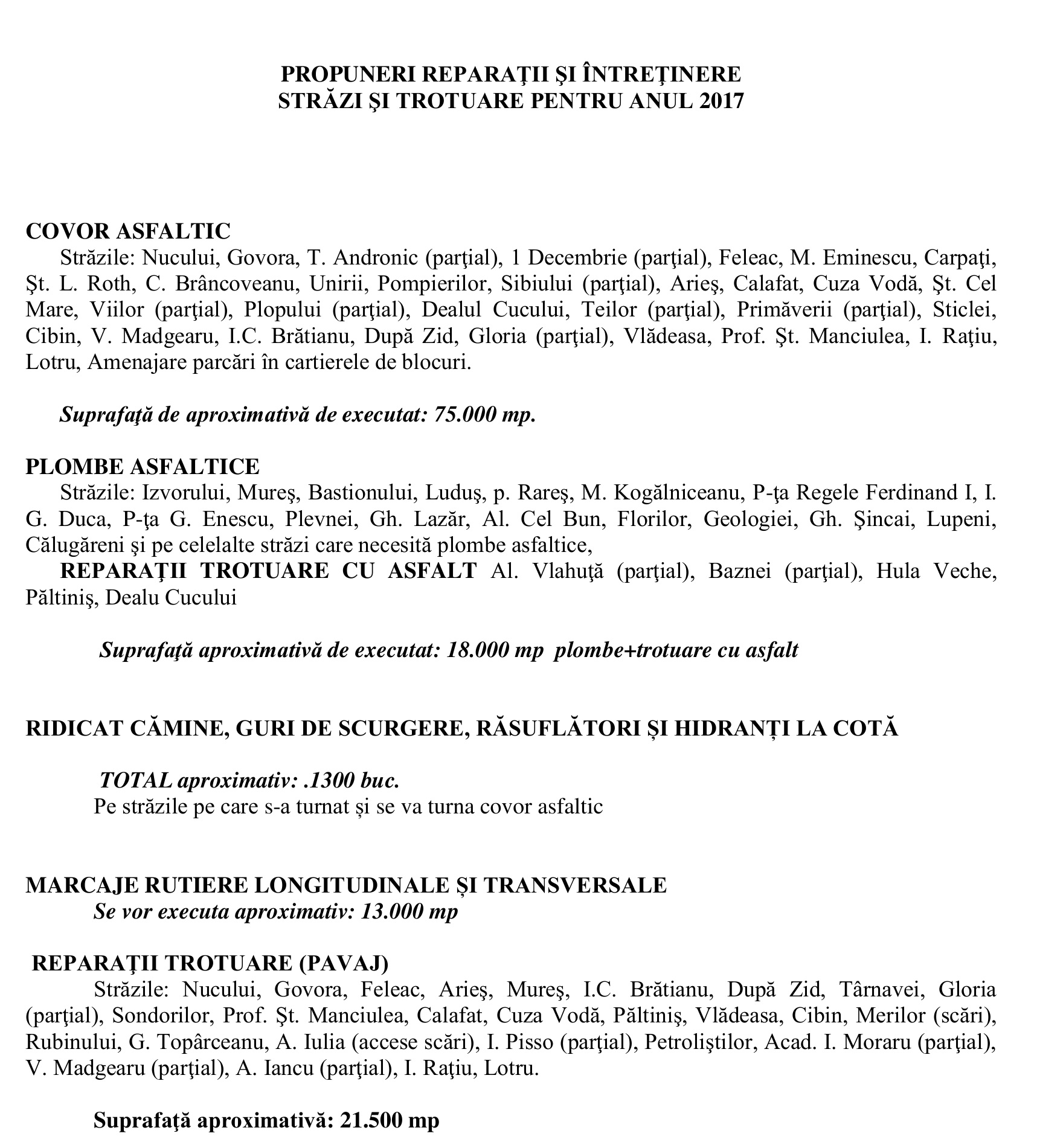 Reabilitarea infrastructurii rutiere este prioritatea zero a municipalității pentru 2017. Astfel, în bugetul pe anul în curs, aflat actualmente în lucru, au fost prevăzute sume importante pentru lucrări de reparații și modernizare a străzilor. Pe 32 străzi se va turna covor asfaltic, integral sau parţial.