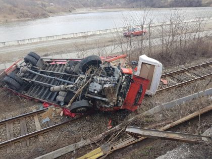 Un tir, o autoutilitară și un autoturism s-au ciocnit la Câineni în județul Vâlcea. Șoferul autoturismului a pătruns pe contrasens, a lovit autoutilitara, iar apoi tirul care a căzut pe calea ferată. În urma impactului, o persoană din autoturism a fost rănită.