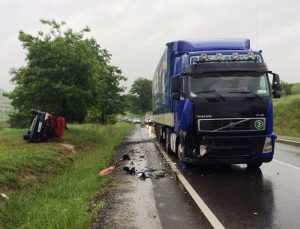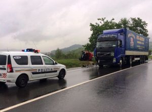 La intrarea în comuna Târnava, un conducător auto care circula spre Mediaș, nu a adaptat viteza în curbă, a pătruns pe contrasens și a intrat în coliziune cu un tir care circula regulamentar.