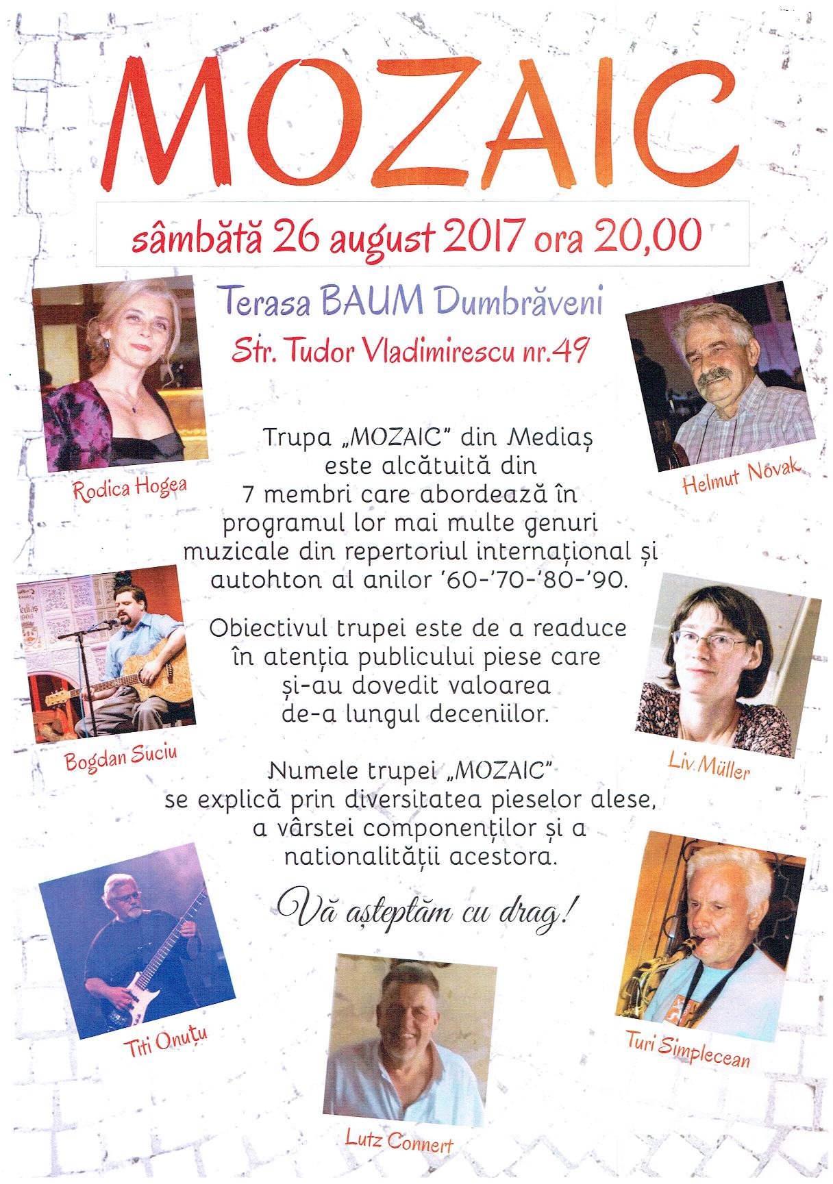 Numele trupei Mozaic se explică prin diversitatea pieselor alese, a vârstei componenților și a naționalității acestora. Trupa este formată din Rodica Hogea, Helmut Novak, Bogdan Suciu, Liv Muller, Titi Onuţiu, Turi Simplecean şi Lutz Connert.