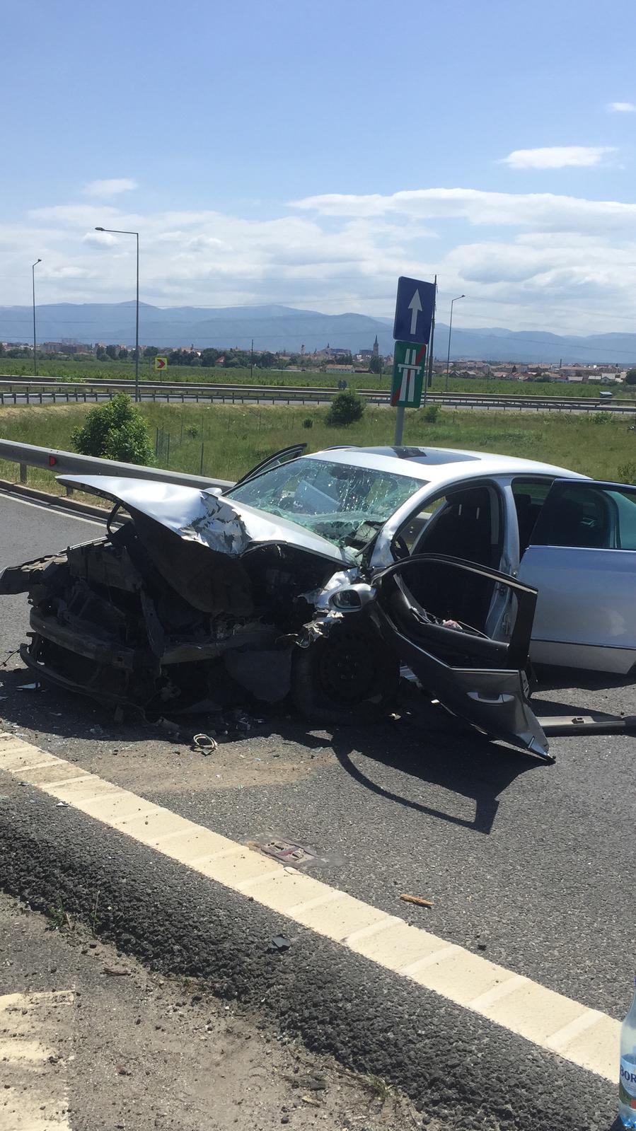 Acesta a avut loc marți după-amiază în jurul orei 14:00 la ieșirea de pe autostradă spre Mediaș. Conducătorul auto a intrat în coliziune cu glisiera dreapta. În urma impactului, trei persoane, șoferul și două pasagere, au fost rănite. Una dintre persoane prezintă un traumatism facial, a doua suspiciune de fractura membru superior, iar a treia un traumatism toracic.
