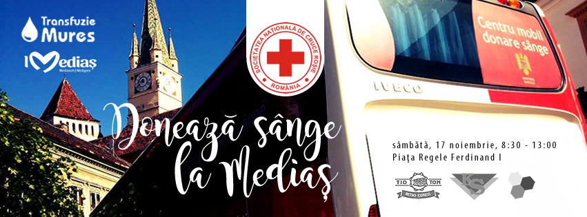 Unitatea mobilă a Centrului de Transfuzie Târgu Mureş, alături de Crucea Roşie Mediaş şi I Love Mediaş, cu sprijinul Tio Tom Bistro și Konsta Splendid, anunţă organizarea celei de-a 6-a sesiuni mobile de donare de sânge, sâmbătă, 17 noiembrie, între orele 8:30 – 13:00, în Piaţa Regele Ferdinand I.
