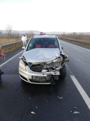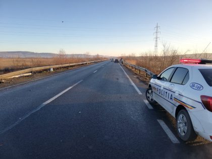 Între Avrig și Porumbacu de Jos, șoferul unui autoturism condus spre Brașov nu păstrează distanța de siguranță față de o mașină care frânează pentru a vira la stânga, intră în coliziune cu aceasta și o proiectează în afara părții carosabile.
