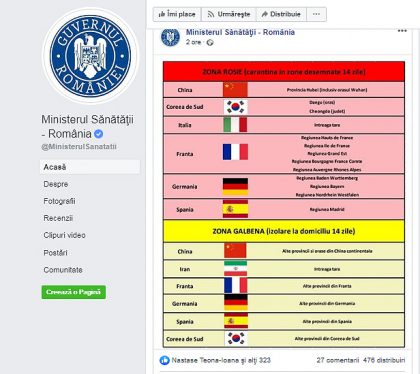Totodată, Ministerul Sănătății a postat pe Facebook și o fotografie în care erau precizate toate zonele considerate roșii, respectiv galbene şi în care apare Germania, ţară de care nu se ştia că a intrat pe listă. Ulterior fotografia a fost ştearsă.