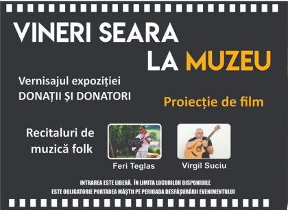 În această săptămână, seara de vineri cuprine vernisajul expoziției „Donații și donatori“, moment ce va fi urmat de 2 recitaluri de muzică folk susținute de medieșenii Feri Teglaș și Virgil Suciu.
