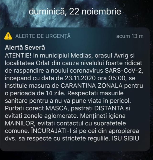 Duminică dimineața, ISU Sibiu a transmis un mesaj de avertizare și informare RO – ALERT privind instaurarea începând cu data de 23 noiembrie, ora 5:00 a perioadei de carantinare pentru o perioadă de 14 zile, a municipiului Mediaș și a localităților Avrig și Orlat.