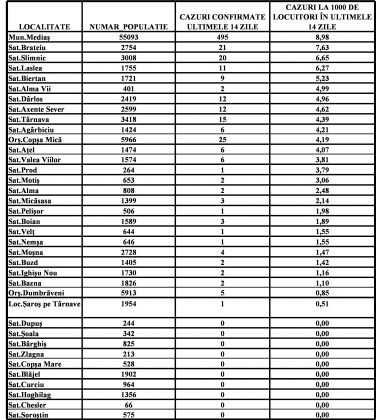 În ceea ce privește rata de incidență COVID cumulată în localitățile din Mediaș și zonă, este următoarea: