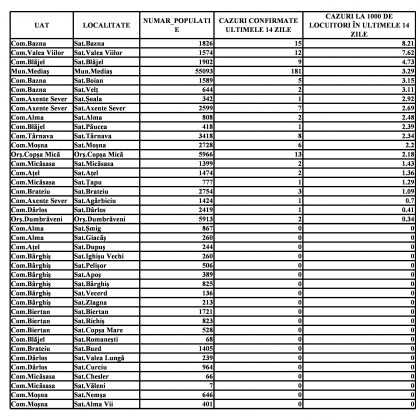 Astfel, conform Prefecturii Sibiu, în municipiul Mediaș rata incidenței cazurilor de COVID-19 era duminică de 3,29 față de 3,56 conform raportării de sâmbătă. În ceea ce privește județul Sibiu, rata continuă scăderea, fiind de 2,71 cazuri la mia de locuitori, față de 2,87 cât era cu patru zile în urmă.