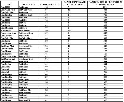 În ceea ce privește rata de incidență COVID cumulată în localitățile din Mediaș și zonă, aceasta este următoarea: