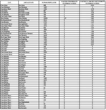 Conform Prefecturii Sibiu, în municipiul Mediaș rata incidenței cazurilor de COVID-19 era marți de 2,85 față de 2,87 conform raportării de luni. În ceea ce privește județul Sibiu, rata este de 1,61 cazuri la mia de locuitori, față de 1,63 pe 18 ianuarie.
