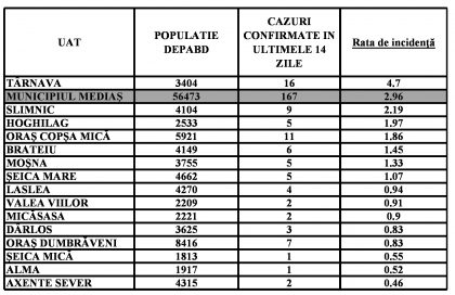Localitățile din zona Mediaș care nu mai apar în tabel au incidența zero.