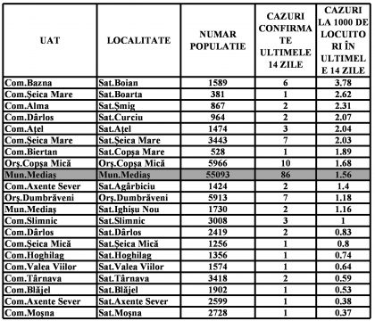 Localitățile din zona Mediaș care nu mai apar în tabel au incidența zero.