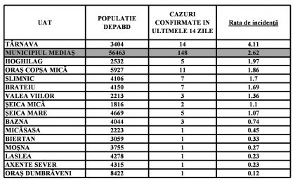 Localitățile din zona Mediaș care nu mai apar în tabel au incidența zero.