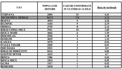 Localitățile din zona Mediaș care nu mai apar în tabel au incidența zero.