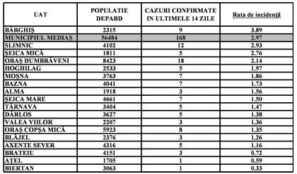 Localitățile din zona Mediaș care nu mai apar în tabel au incidența zero.