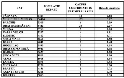 Localitățile din zona Mediaș care nu mai apar în tabel au incidența zero.