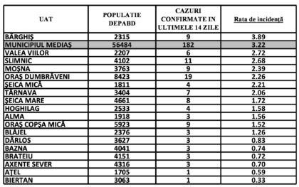 Localitățile din zona Mediaș care nu mai apar în tabel au incidența zero.