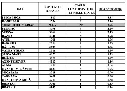 Localitățile din zona Mediaș care nu mai apar în tabel au incidența zero.