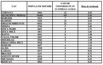 Localitățile din zona Mediaș care nu mai apar în tabel au incidența zero.