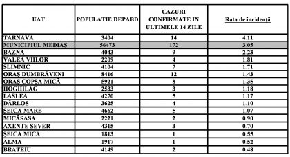 Localitățile din zona Mediaș care nu mai apar în tabel au incidența zero.