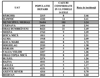 Localitățile din zona Mediaș care nu mai apar în tabel au incidența zero.