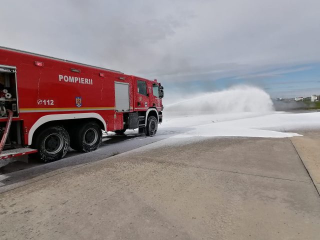 40 de pompieri și 12 autospeciale au participat joi la un exercițiu de anvergură la Aeroportul Internațional Sibiu.