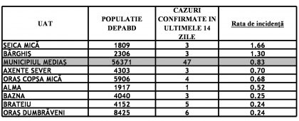 Localitățile din zona Mediaș care nu mai apar în tabel au incidența zero.