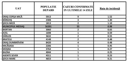 Localitățile din zona Mediaș care nu mai apar în tabel au incidența zero.