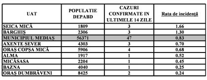 Localitățile din zona Mediaș care nu mai apar în tabel au incidența zero.