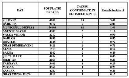 Localitățile din zona Mediaș care nu mai apar în tabel au incidența zero.