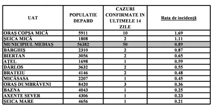 Localitățile din zona Mediaș care nu mai apar în tabel au incidența zero.