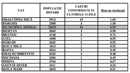 Localitățile din zona Mediaș care nu mai apar în tabel au incidența zero.