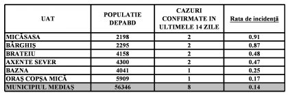 Localitățile din zona Mediaș care nu mai apar în tabel au incidența zero.