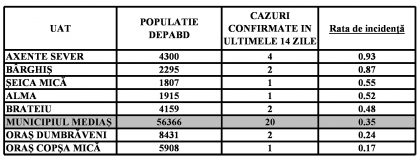 Localitățile din zona Mediaș care nu mai apar în tabel au incidența zero.