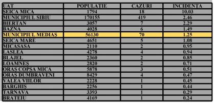 Rata de incidență cumulată în UAT-urile din zona Mediaș și municipiul Sibiu este următoarea: